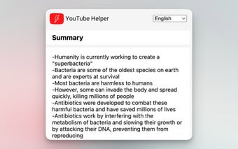 {\"translation\": \"YouTube Helper เป็นส่วนขยายของ Chrome ที่ออกแบบมาเพื่อสรุปเนื้อหาของวิดีโอ YouTube โดยอัตโนมัติ ให้ภาพรวมที่กระชับของจุดหลักหรือข้อความสำคัญ ผู้ใช้สามารถเข้าใจสาระสำคัญของวิดีโอได้อย่างรวดเร็วผ่านข้อความที่แสดงในป๊อปอัพของส่วนขยาย นอกจากนี้เครื่องมือนี้ยังสามารถแปลเนื้อหาที่พูดหรือเขียนในวิดีโอ YouTube จากภาษาหนึ่งเป็นอีกภาษาหนึ่ง เพื่อเสริมความสะดวกและความเข้าใจสำหรับผู้ชมที่หลากหลาย\" }```